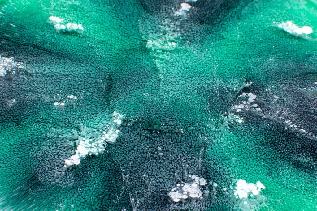 - Add a drop of the Alcohol Ink “SELENIT WHITE” to the colored dye (“EMERALD TURQUOISE”). The colors displace each other and create an individual pattern. The more white drops you put on the colored drop, the deeper the colors sink into the resin and the stronger the Alcohol Ink effect is.