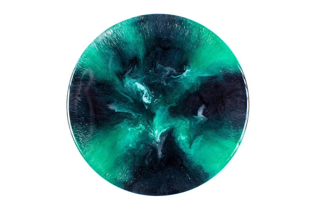 - Drop the Alcohol Ink “EMERALD TURQUOISE” onto the wet resin-hardener mixture.