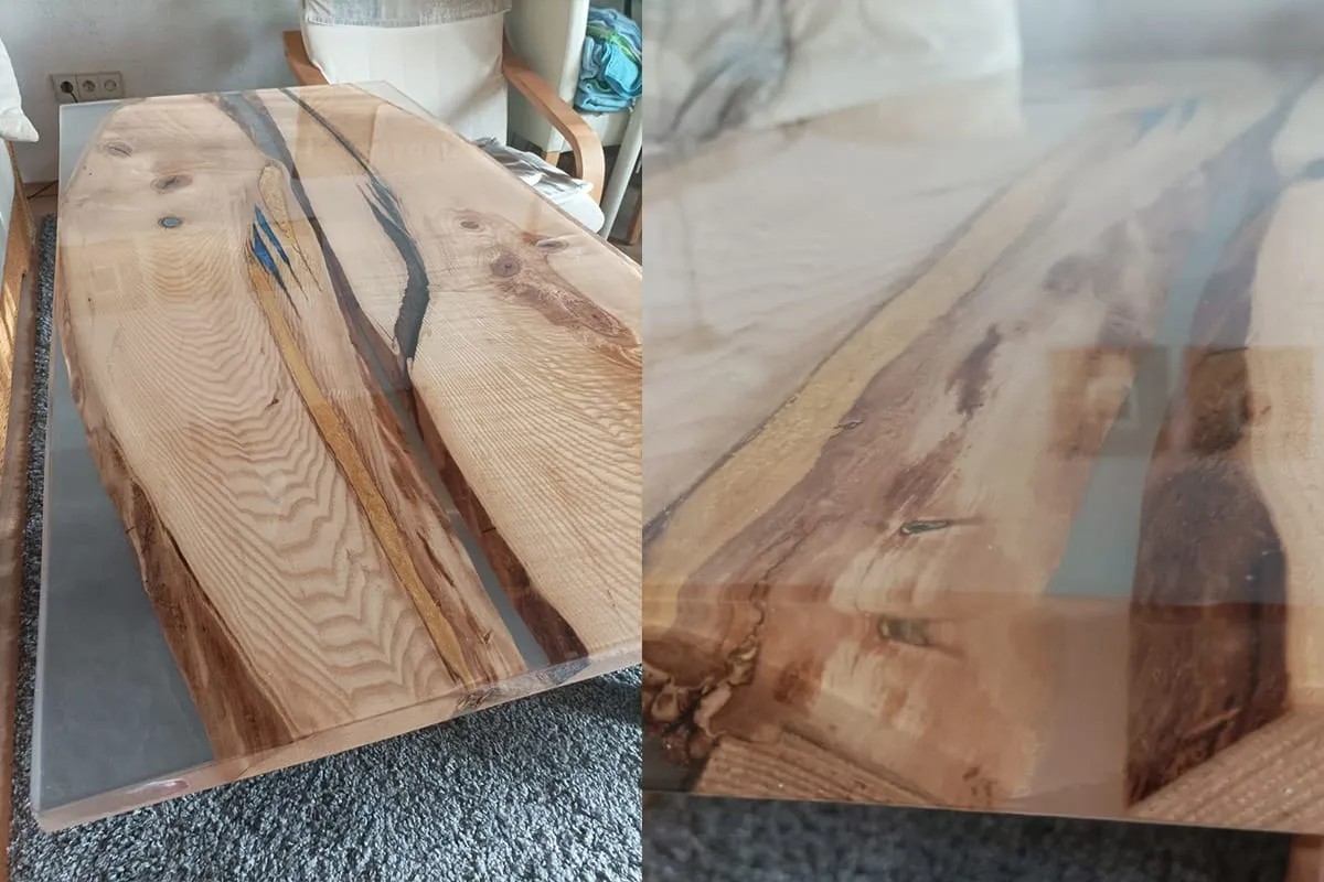 Info: Epoxy resin is sensitive to any kind of moisture during curing (risk of amine blush formation, i.e., white patches in the top layer). For this reason, we recommend that you avoid any contact between water and the epoxy until it has cured completely. For thin layers, cold temperatures (ambient, substrate, and resin temperatures below 70°F), and increased humidity, the time until the epoxy resin is fully cured may be extended.