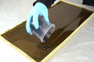 Info: Epoxy resin is sensitive to any kind of moisture during curing (risk of amine blush formation, i.e. white patches in the top layer). For this reason, we recommend that you avoid any contact between water and the epoxy until it has cured completely (at least 7 days). For thin layers, cold temperatures (ambient, substrate, and resin temperatures below 60°F) and increased humidity, the time until the epoxy resin is fully cured may be extended.
