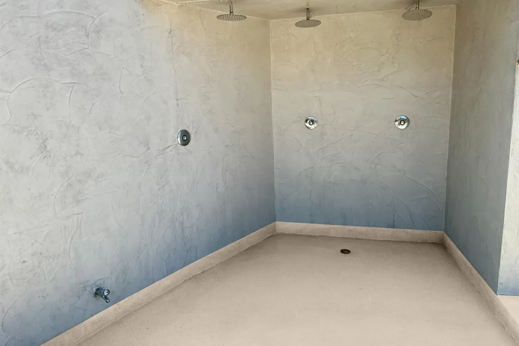 EPODEX microcement in combination with our polyurethane resin (PU) sealant is waterproof and weather resistant. It is therefore ideal for showers and outdoor areas. The sealing layer is finally rolled onto the hardened microcement.