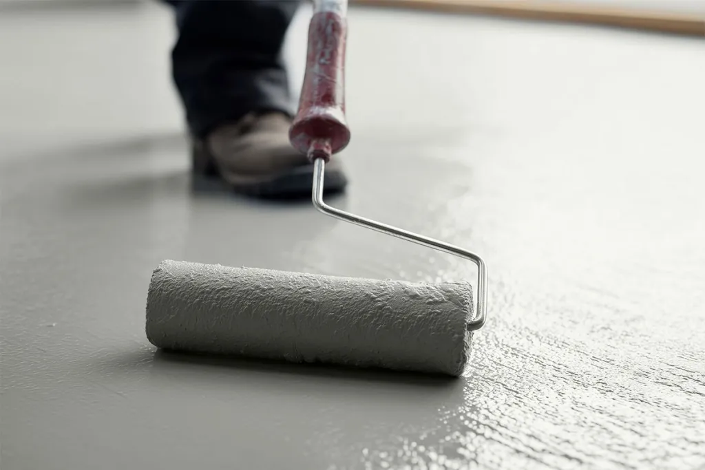 Do not wear rubber-soled shoes while sanding, cleaning, after cleaning, or during the application of the 2K PU Paint, as rubber microparticles may cause an uneven finish. Rubber-soled shoes can be worn once the second coat of 2K PU Paint is cured. Wait until the 2K PU Paint is walkable (approx. 6 hours) before applying the second coat.