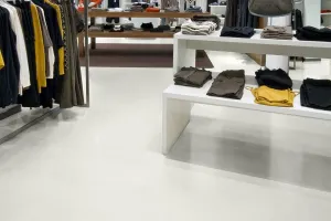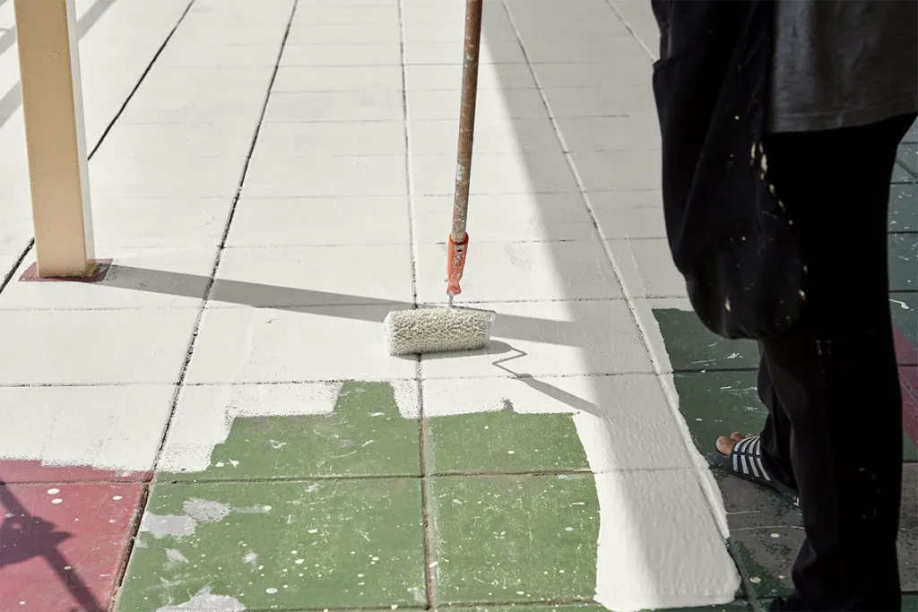 Do not wear rubber-soled shoes while sanding, cleaning, after cleaning, or during the application of the 2K PU Paint, as rubber microparticles may cause an uneven finish. Rubber-soled shoes can be worn once the second coat of 2K PU Paint is cured. Wait until the 2K PU Paint is walkable (approx. 6 hours) before applying the second coat.